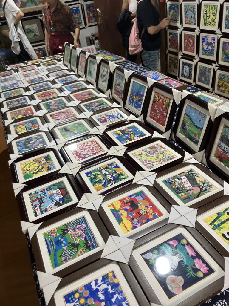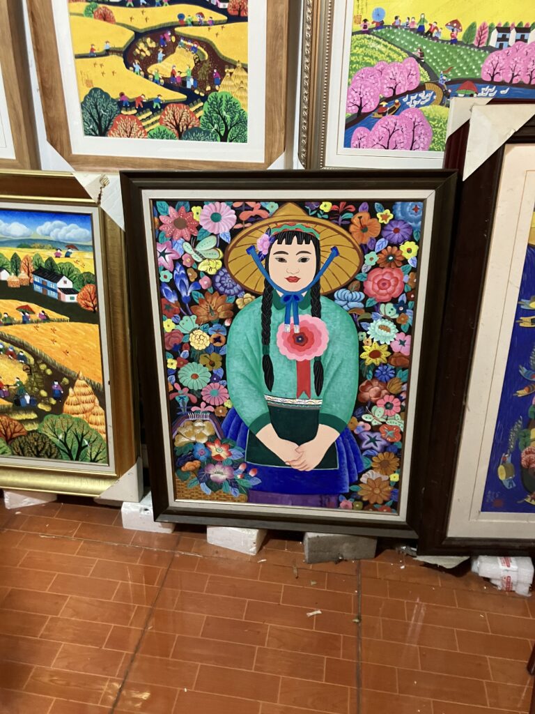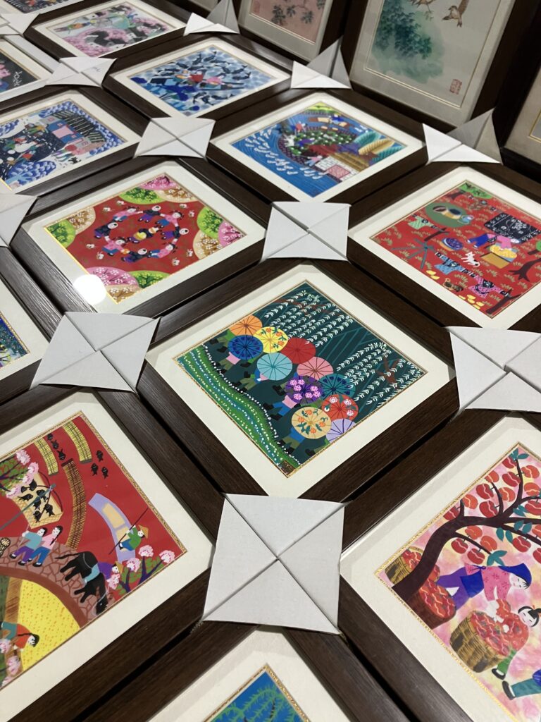 農民画村の中に入って行くと、いくつか家が建ってあり、その中に農民画家が住んでおり実際に農民画を描いています。私も曹秀文一という農民画家の家にお邪魔して彼女の作品をたくさん見させていただきました。カラフルで可愛らしい絵が農民画の特長でどれだけ見ていても全く飽きないくらい素敵な作品が沢山飾られています!!