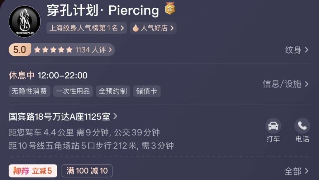 私が行ったのは↓の画像のお店で、軟骨に、猫耳になるように2つピアスを開けてお値段なんと266元でした!